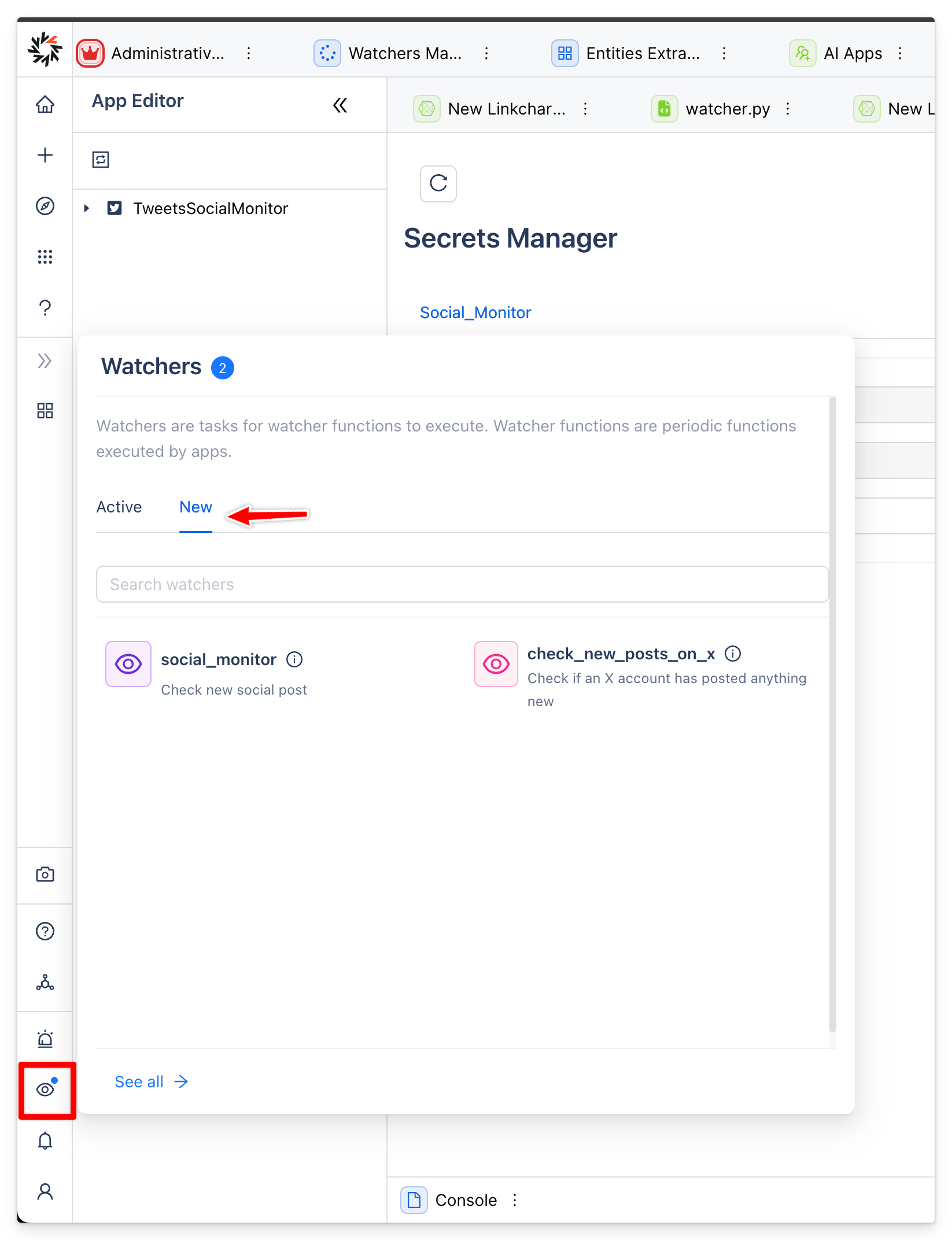 An app may declare in its manifest one or more watcher functions. Once this app is deployed, a user can create "watcher intent" entities in workspaces. These special entities represent the intent of a user to periodically run a specific watcher function (at the interval defined in the manifest, for example every 20m).