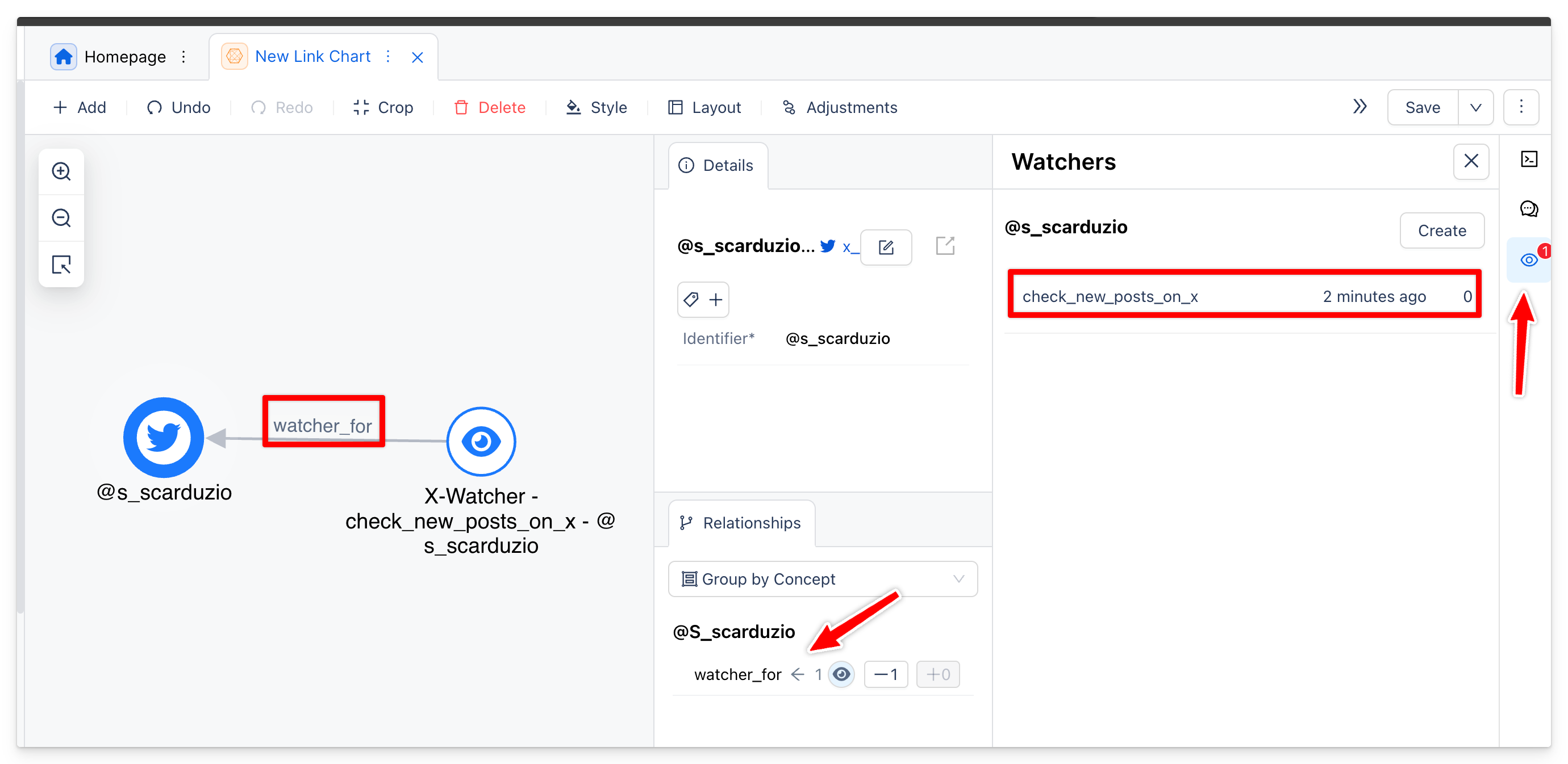 Octostar will create also a relationship between the watched entity and the watcher intent (which is also an entity). Let's visualize this using our Link Chart