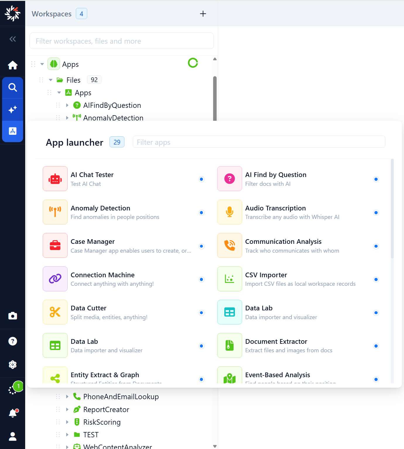 - Conduct specialized analyses on files, records, or datasets. Apps open in the main area and can be launched via the App Launcher or the Open with… option on a workspace item. They adhere to your workspace context and permissions. The output from an app is saved back to your workspace as files, records, or Link Charts, ensuring results remain linked to your case.