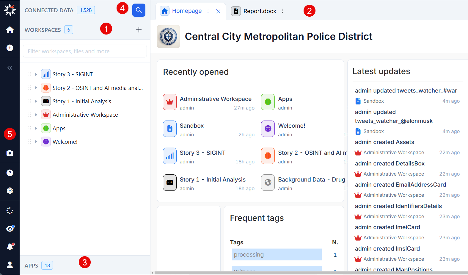 - The Workspace area: here you can see the currently open workspaces. Workspaces are mostly used to separate content of different investigations, but sometimes they're used for other purposes (see later description). If you dont see anything in the workspace area, just press the + sign to open one or more from those you have access to (or create one)