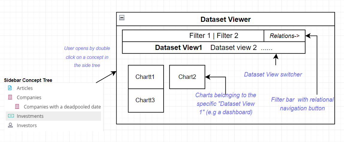- Lastly under the switcher bar, there is the content of the specific Dataset View that is currently selected - eg. the visualizations of the specific dashboard which is acting as Dataset view at this time.