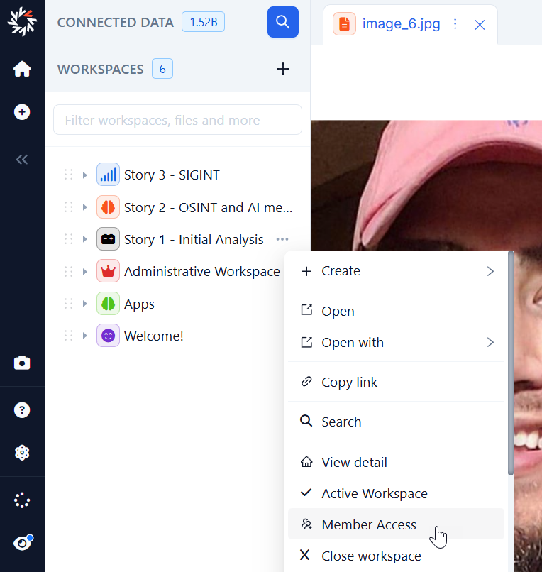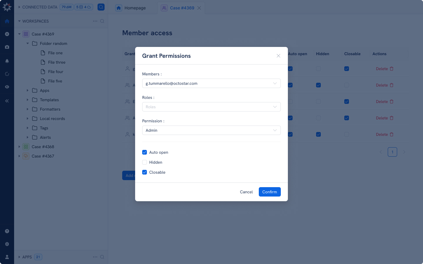 Octostar allows one to share workspace swith other users or roles in read / write / admin mode - not unlike other popular file collaboration solutions. These settings can be changed in the "member access" section of the contextual menu of workspaces